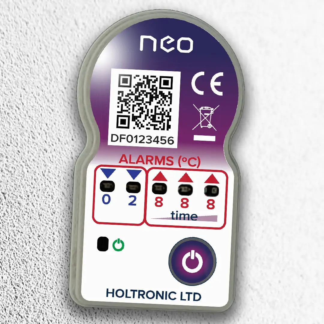 Temperature Range: The neo TTI actively monitors temperatures from -20°C to 60°C. An intelligent processor integrates all temperature readings to calculate shelf life or state-of-health figures.