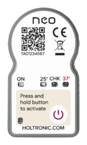 Electronic Time-Temperature Integrator Indicator. Visually displays when temperature exceeds 25°C, 37°C and when Calprotectin residual activity falls below 80%.